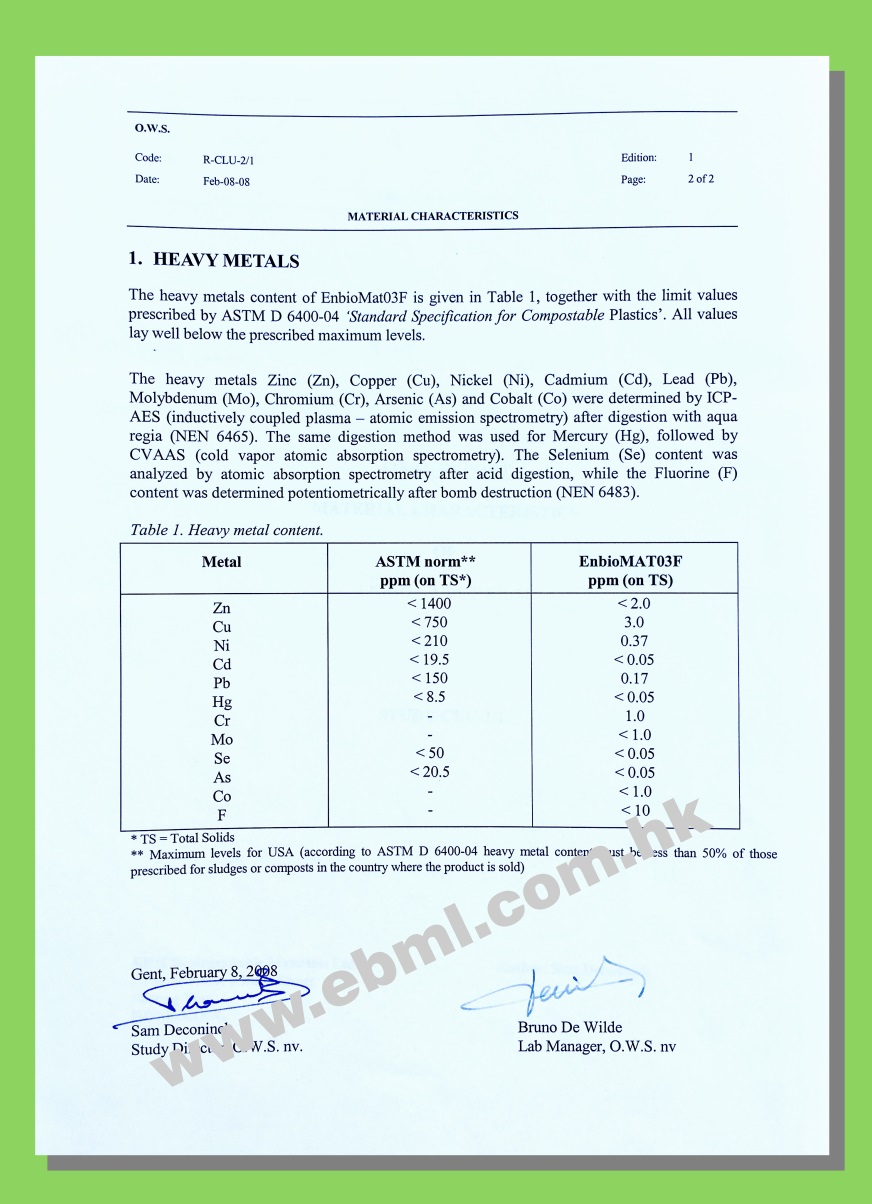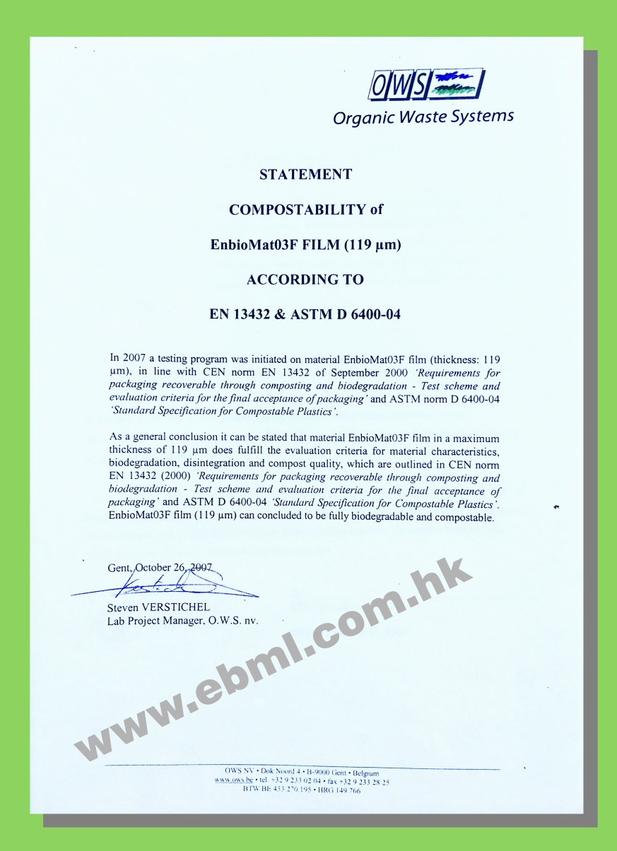 plastics/bags),包括垃圾袋。 所謂氧化式降解,簡單來說即是在生產傳統塑料袋時 (例如LDPE、HDPE或PP等),在生產原料中添加降解劑 (具體是哪種添加劑,可參考環保署網頁),使到含有降解劑的塑料袋在光、氧化作用下首先崩裂成細小碎片,繼而最後達至完全分解。由於在崩裂的過程中有可能會產生大量的微塑膠,所以在另一方面看,其造成的污染可能比單一的”白色污染”更嚴重。 隨著環保署的禁令,如果用家想其使用的垃圾袋環保一些,可選擇: 1. 採用不含降解劑的傳統塑料,但添加>20%甚至>50%循環再造塑膠料,以達至減少使用新資源的目的。 2. 使用不含傳統塑料做的袋,例如使用植物澱粉+PBAT。植物澱粉+PBAT做成的袋在堆肥環境下可完全生物分解,其分解方式不屬於環保署禁止使用的氧化式降解。詳情請瀏覽我司專頁:(www.ebml.com.hk ) 以下證書是以植物澱粉+PBAT做成的袋在可控堆肥環保下,產品通過以HS2001,EN13432和 ASTM D6400標準檢測合格。詳情請瀏覽我司專頁:(www.ebml.com.hk ) |